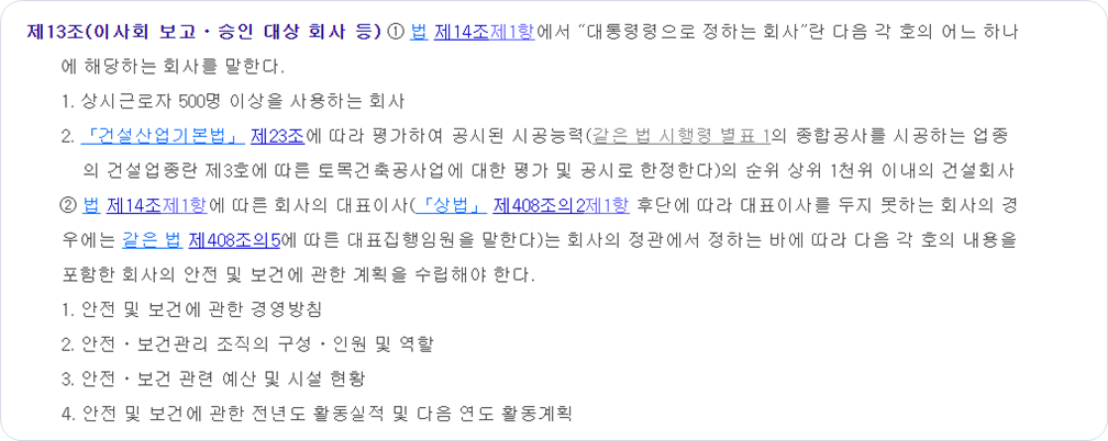 - 산업안전보건법 시행령 제13조 (이사회 보고ㆍ승인 대상 회사 등)