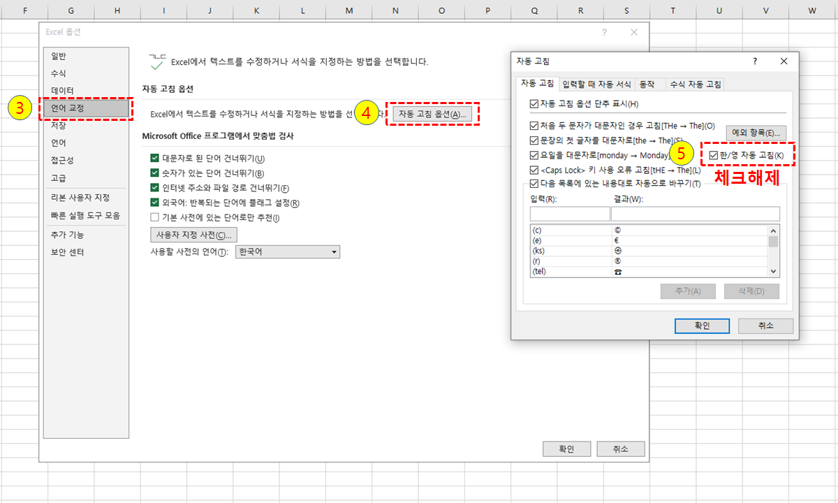① 파일 → ② 옵션 → ③ 언어교정 ④ 자동고침옵션 ⑤ 한/양 자동고침 옵션 해제