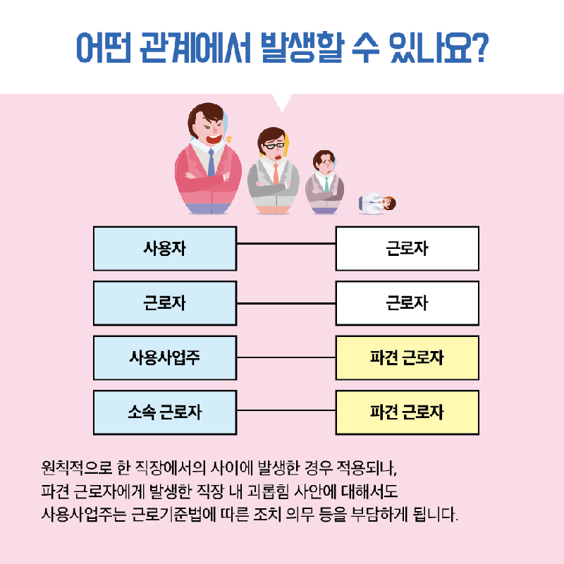 사용자나 근로자가 직장에서 지위 또는 관계우위를 이용하여 다른 근로자에게 신체적ㆍ정신적 고통을 주는 등의 행위