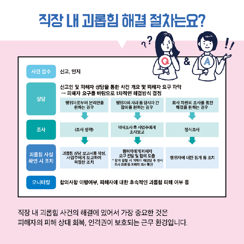 | ① 누구든지 직장 내 괴롭힘 발생 사실을 알게 된 경우 그 사실을 사용자에게 신고할 수 있다. ② 사용자는 제1항에 따른 신고를 접수하거나 직장 내 괴롭힘 발생 사실을 인지한 경우에는 지체 없이 그 사실 확인을 위한 조사를 실시하여야 한다. ③ 사용자는 제2항에 따른 조사 기간 동안 직장 내 괴롭힘과 관련하여 피해를 입은 근로자 또는 피해를 입었다고 주장하는 근로자(이하 “피해근로자등”이라 한다)를 보호하기 위하여 필요한 경우 해당 피해근로자등에 대하여 근무장소의 변경, 유급휴가 명령 등 적절한 조치를 하여야 한다. 이 경우 사용자는 피해근로자등의 의사에 반하는 조치를 하여서는 아니 된다. ④ 사용자는 제2항에 따른 조사 결과 직장 내 괴롭힘 발생 사실이 확인된 때에는 피해근로자가 요청하면 근무장소의 변경, 배치전환, 유급휴가 명령 등 적절한 조치를 하여야 한다. ⑤ 사용자는 제2항에 따른 조사 결과 직장 내 괴롭힘 발생 사실이 확인된 때에는 지체 없이 행위자에 대하여 징계, 근무장소의 변경 등 필요한 조치를 하여야 한다. 이 경우 사용자는 징계 등의 조치를 하기 전에 그 조치에 대하여 피해근로자의 의견을 들어야 한다. ⑥ 사용자는 직장 내 괴롭힘 발생 사실을 신고한 근로자 및 피해근로자등에게 해고나 그 밖의 불리한 처우를 하여서는 아니 된다. |