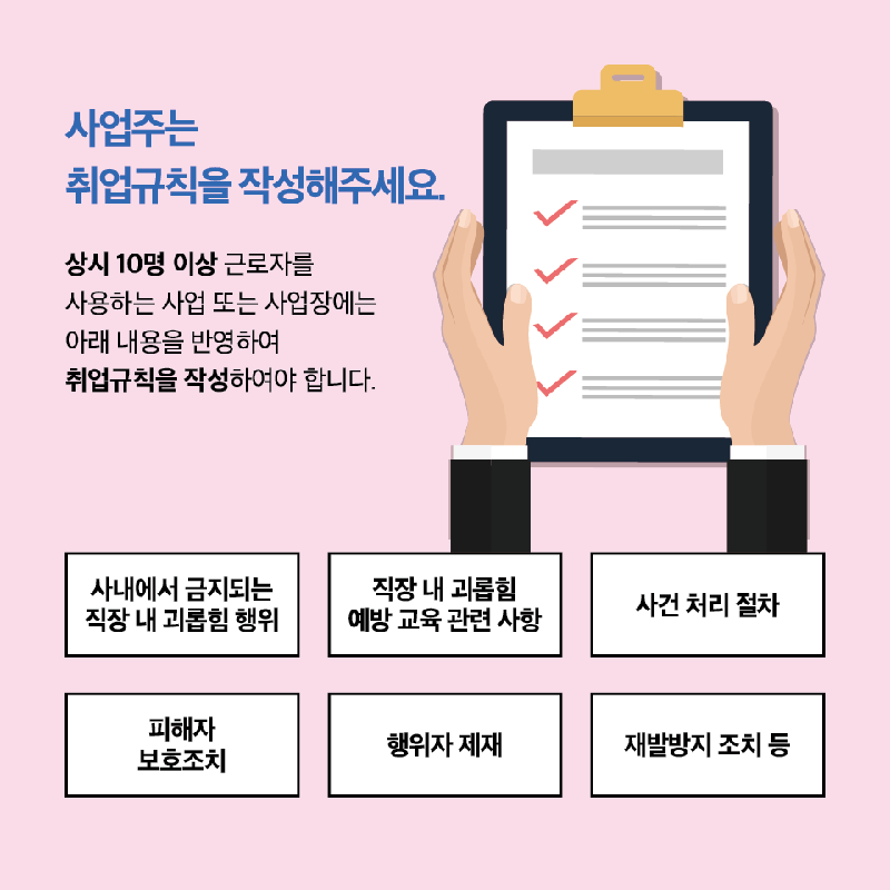 | 상시 10명 이상의 근로자를 사용하는 사용자는 다음 각 호의 사항에 관한 취업규칙을 작성하여 고용노동부장관에게 신고하여야 한다. 이를 변경하는 경우에도 또한 같다. 1. ~ 10. (생 략) 11. 직장 내 괴롭힘의 예방 및 발생 시 조치 등에 관한 사항 12. · 13. (생 략) |