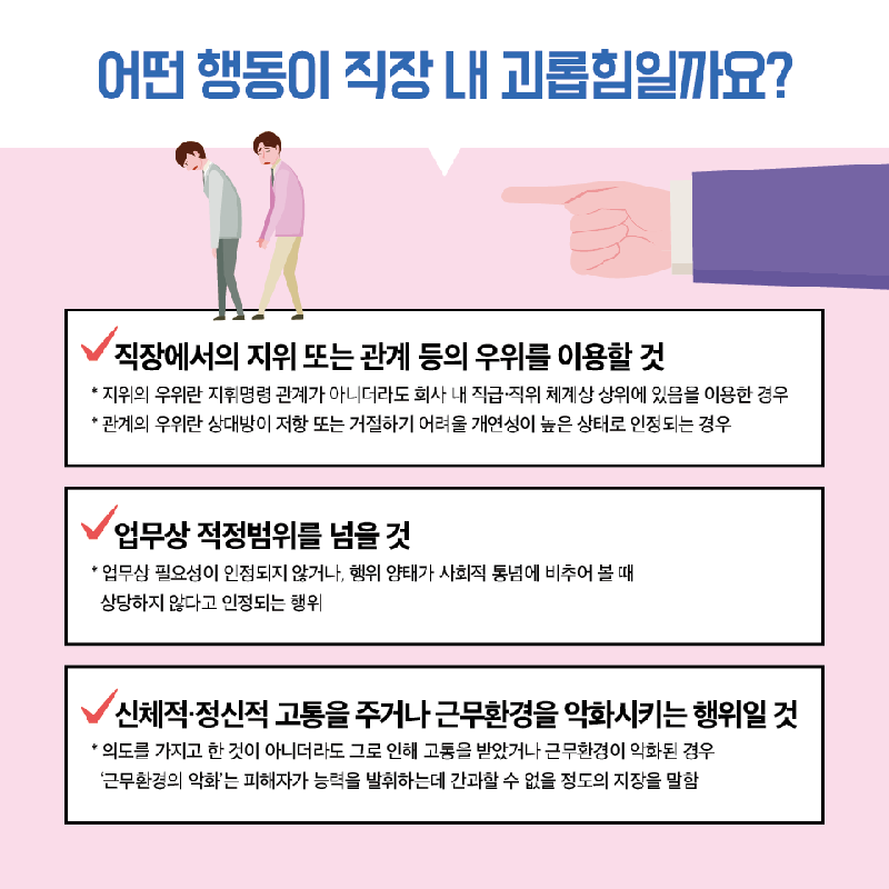 사용자나 근로자가 직장에서 지위 또는 관계우위를 이용하여 다른 근로자에게 신체적ㆍ정신적 고통을 주는 등의 행위