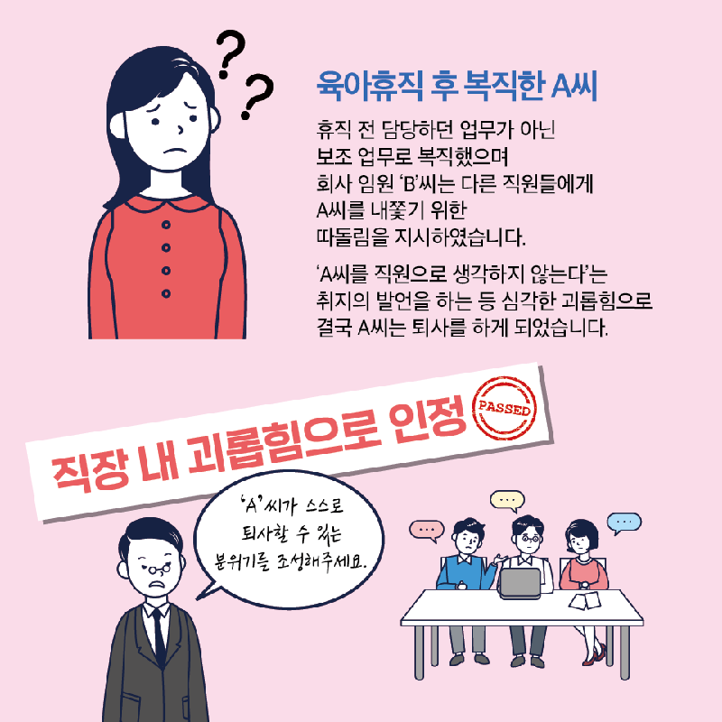 | 육아휴직, 배우자 출산휴가, 난임휴가, 육아기근로시간 단축 등 모성보호에 관한 괴롭힘 | 제18조의2(배우자 출산휴가) 제18조의3(난임치료휴가) 제19조(육아휴직) 제19조의2(육아기 근로시간 단축) 제22조의2(근로자의 가족 돌봄 등을 위한 지원) |
