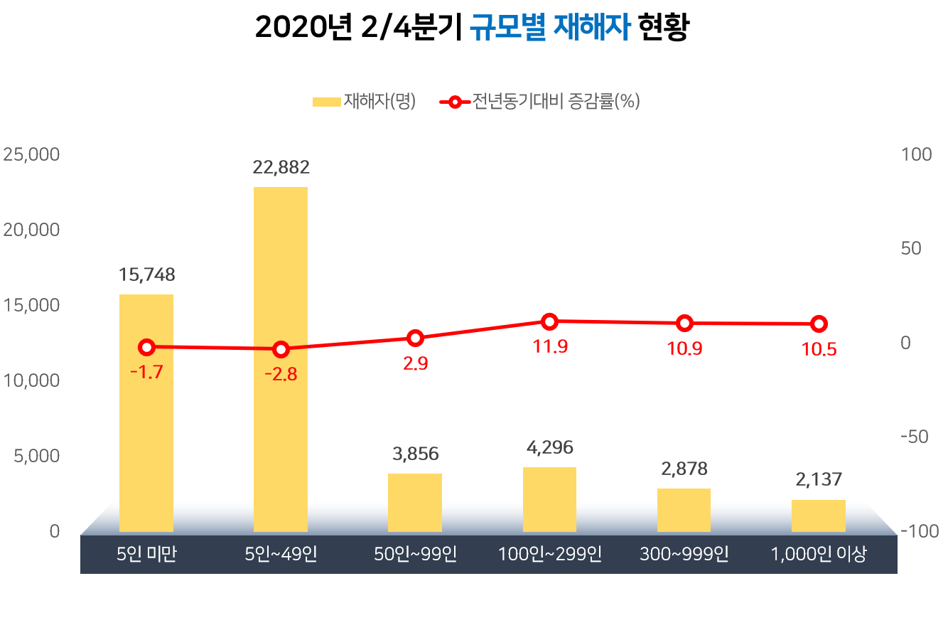 | ○ 재해자는 5인 미만, 5인~49인 사업장은 전년동기 대비 감소하였으나, 50인~99인, 100인~299인, 300인~999인, 1,000인 이상 사업장에서는 전년동기 대비 증가 ○ 사망자는 50인~99인, 300인~999인, 1,000인 이상 사업장은 전년동기 대비 감소하였으나, 5인~49인, 100인~299인 사업장은 전년동기 대비 증가 |