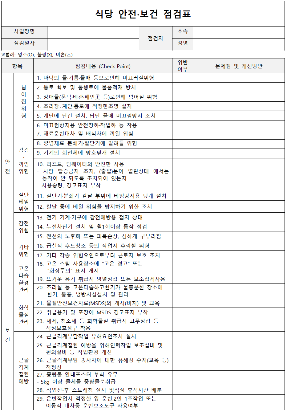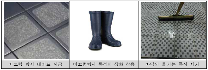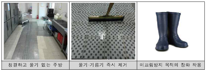 | - 바닥의 물기, 기름기, 음식물 쓰레기 등은 즉시 제거한다. - 미끄럼 방지 목적의 장화를 지급ㆍ착용한다. - 미끄럼에 취약한 장소에는 미끄럼방지용 테이프를 부착한다. - 미끄러운 장소에 미끄럼 주의 경고표지판을 설치한다. - 조리실 내에서는 주변을 살피며 조심히 이동한다. - 작업 전,후 장화, 신발을 확인하고 이상이 있거나 노후된 것은 즉시 교체하여 착용한다. |