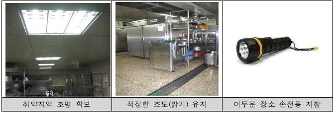 | - 조리장(150럭스 이상) 및 근로자 이동통로 (75럭스 이상) 등은 충분한 조도를 확보한다. - 조명 등을 설치할 수 없는 장소에는 야광안전표지를 부착한다. - 전등과 조명기기를 주기적으로 청소하고 수명이 다 된 조명기구는 즉시 교체한다. - 빛을 가리는 장애물을 제거하고 실내마감재의 색상을 밝게 해 반사율을 높인다. - 식자재 창고, 비상계단 등 어두운 장소에 출입 시 손전등을 지참한다. - 조명간의 거리를 가깝게 하거나 추가로 설치한다. |