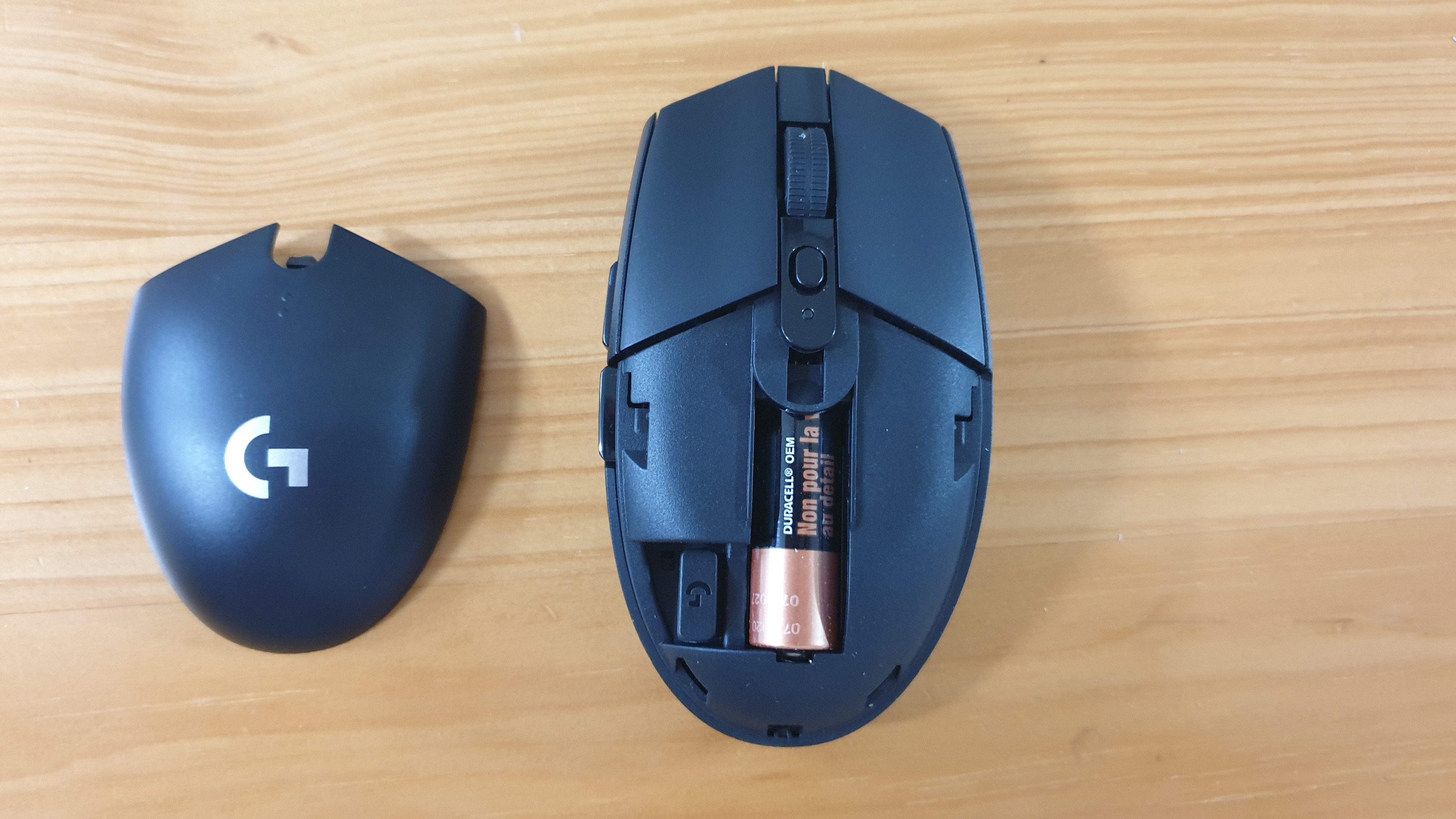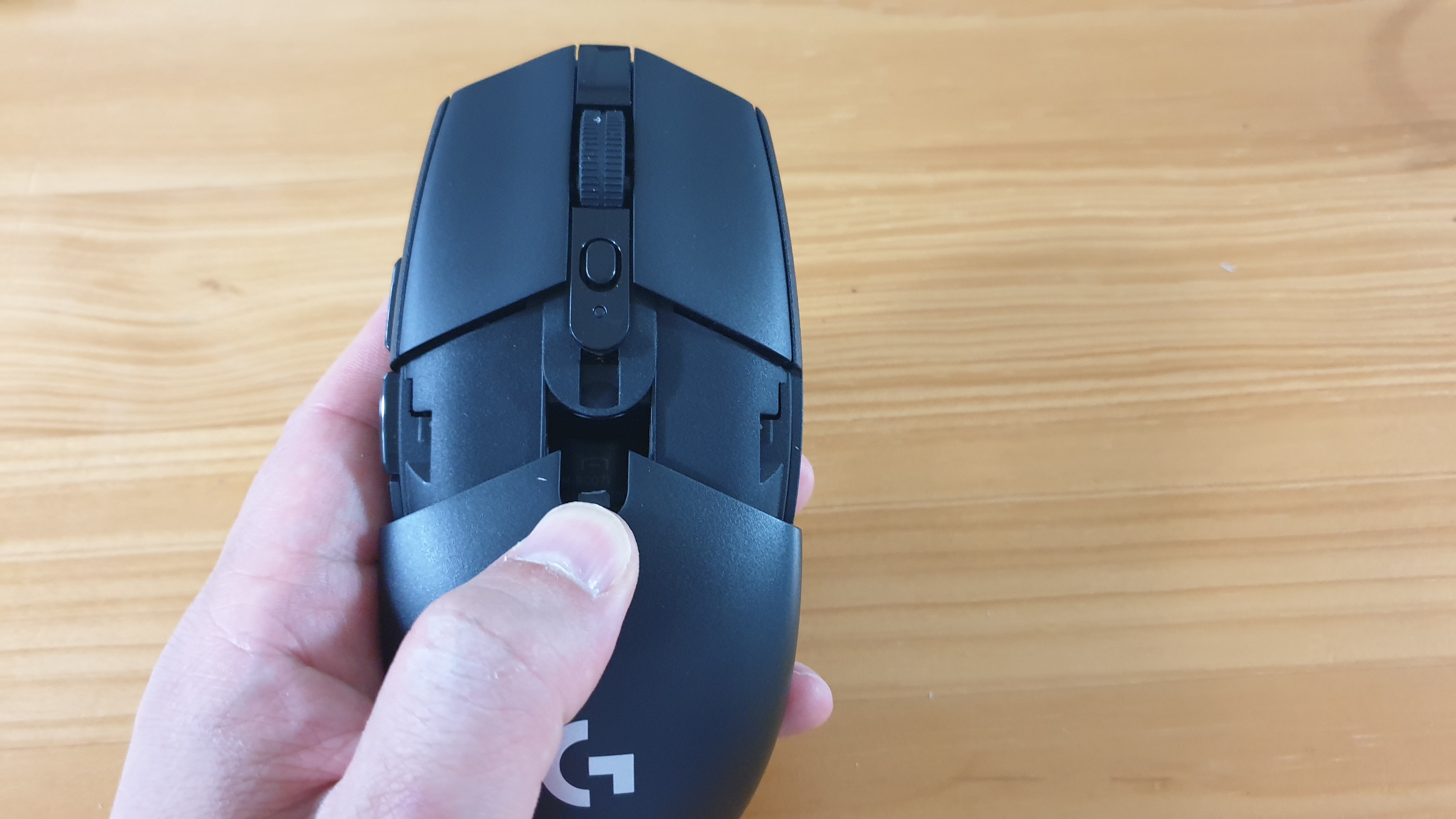 마우스 건전지 넣는 방법은 간단하다 중간 부분을 누르고 아래로 내리면 건전지 투입구가 나타난다.