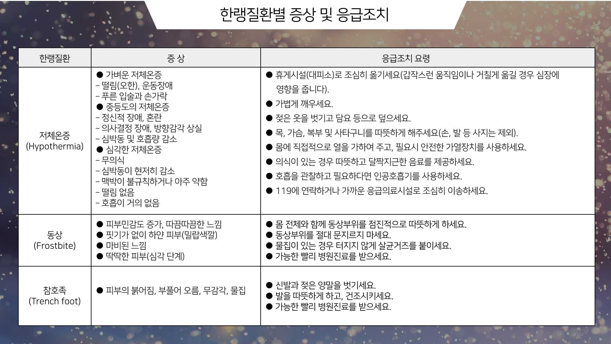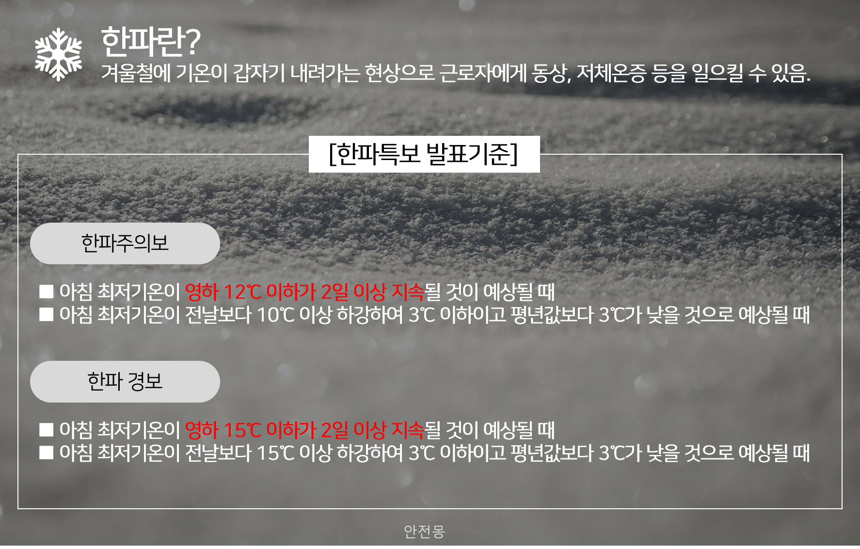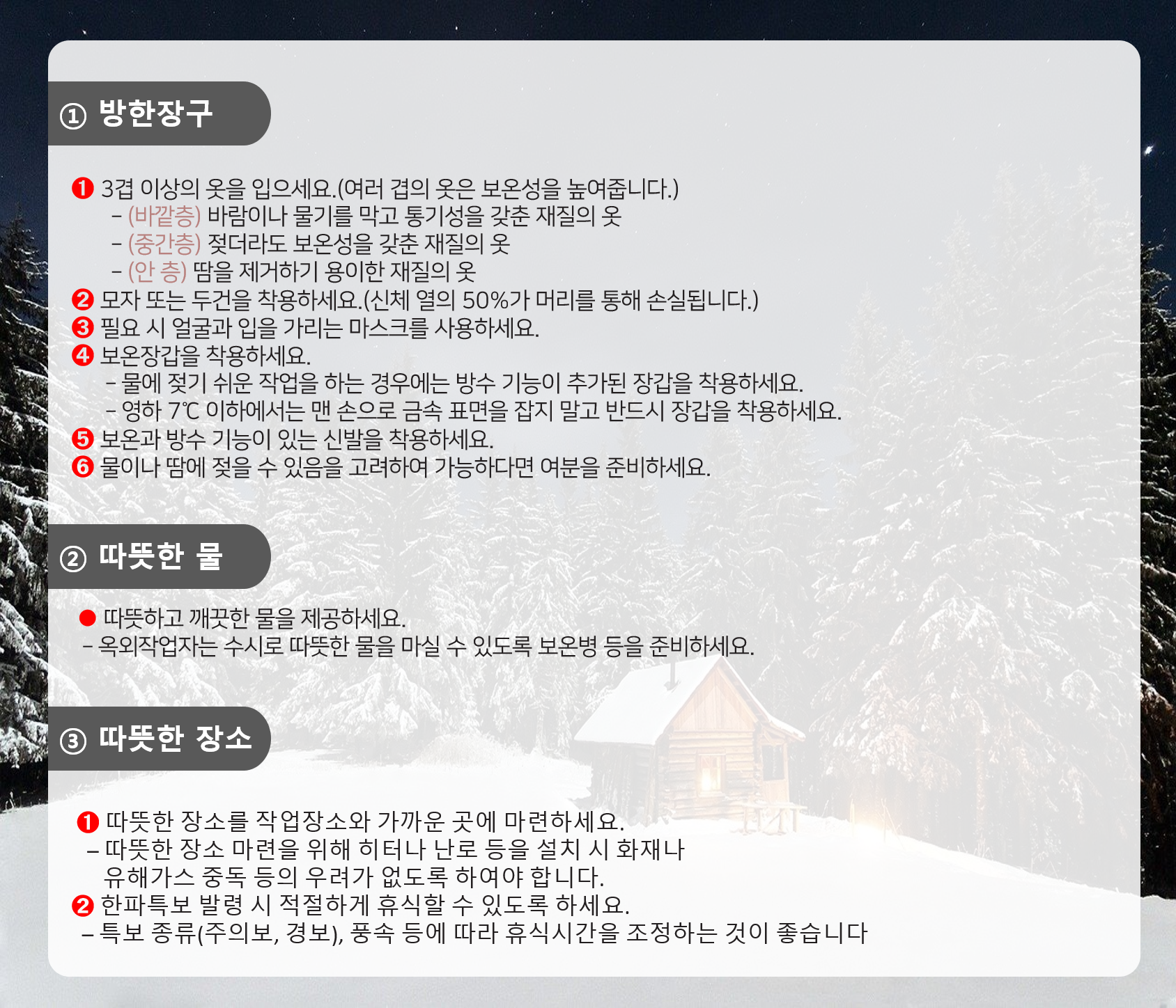 근로자분들의 안전을 위해서는 한랭질환 예방관리가 필요하므로 다음의 기본수칙을 준수하여야 한다.