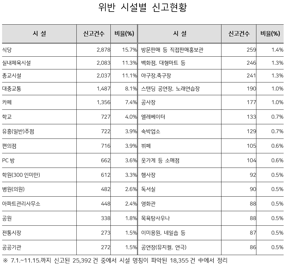 - 위반행동: 마스크 미착용, 거리두기 미흡, 출입명부 미작성 등