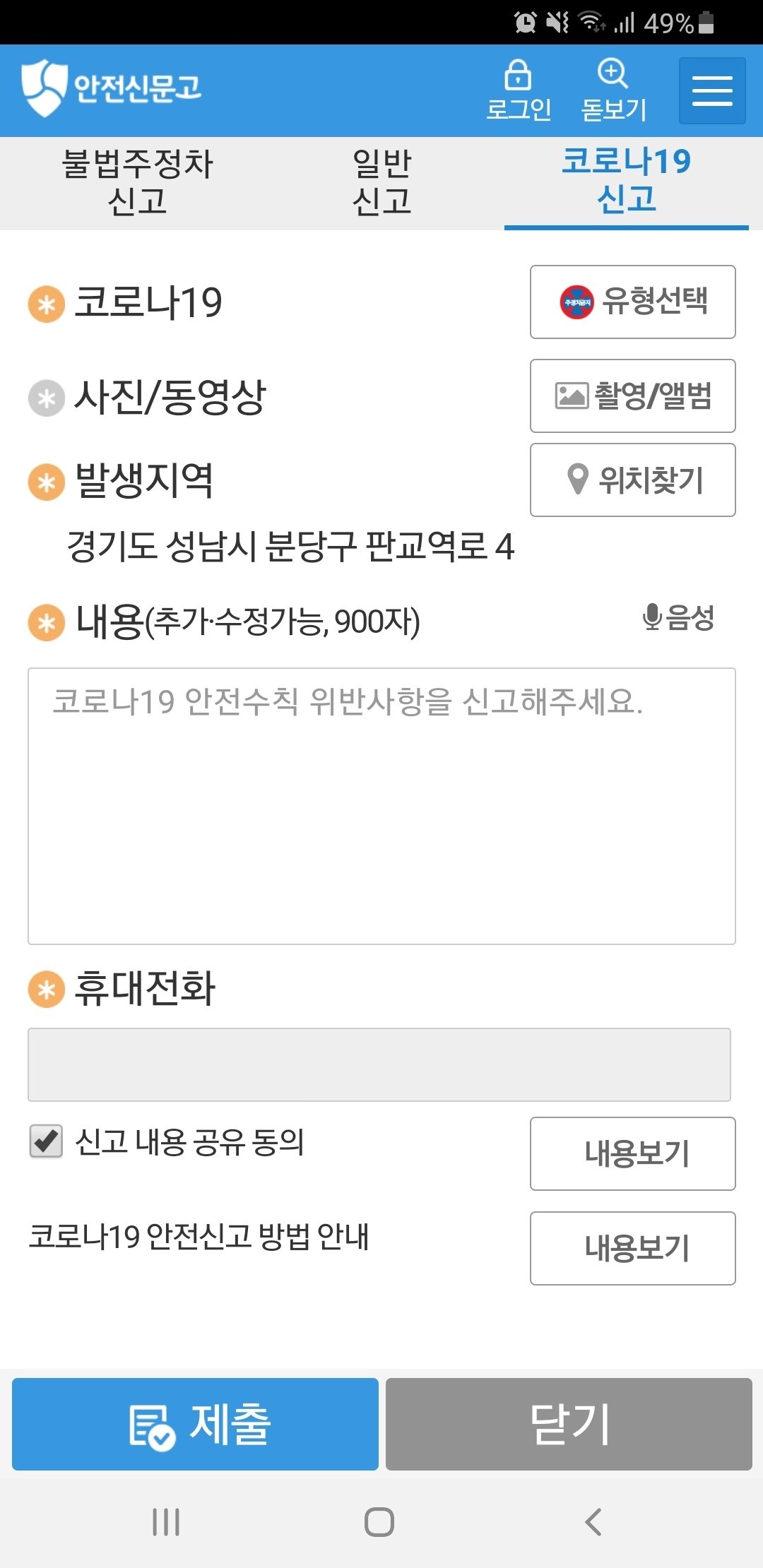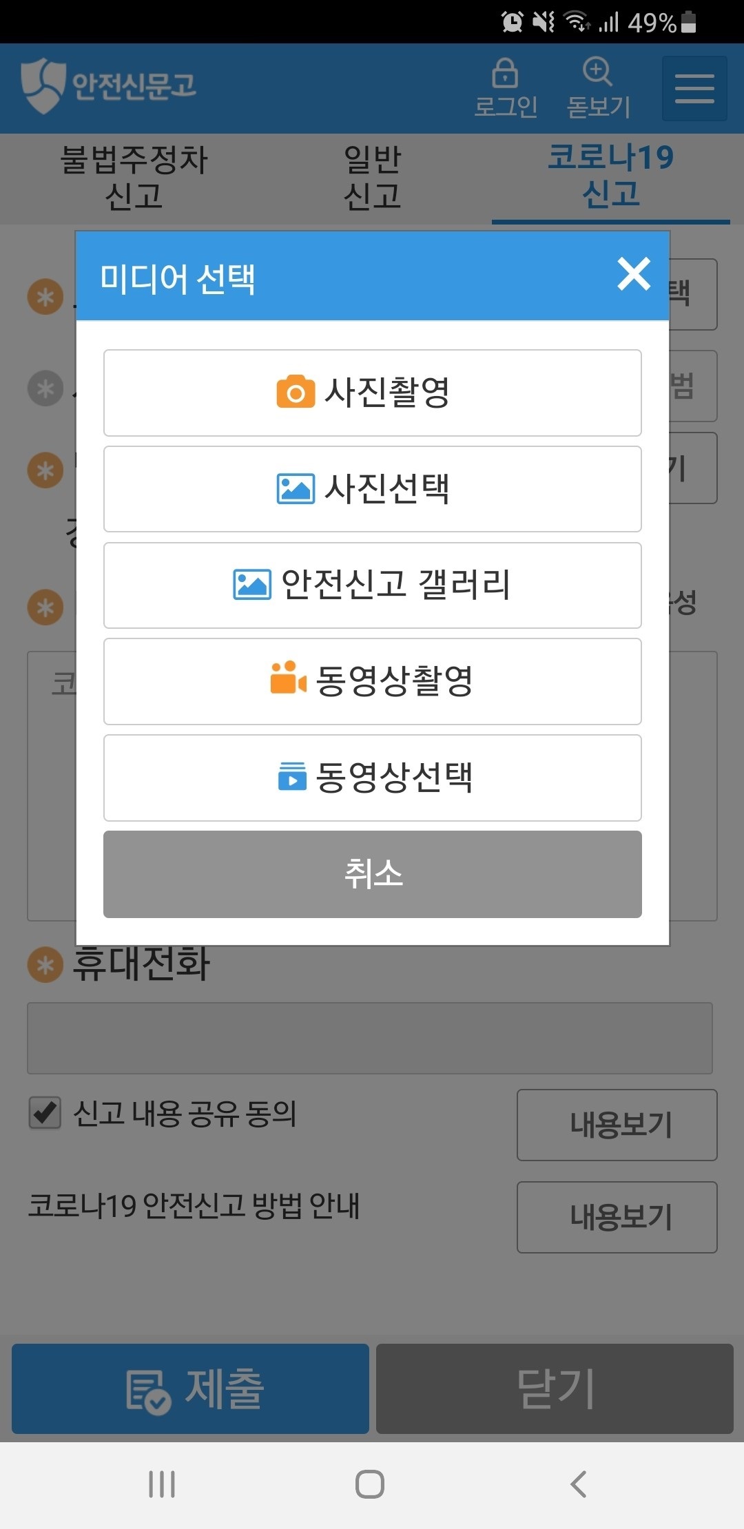 안전신문고 앱 (안드로이드, IOS) 및 포털 에서 바로 코로나19위반사항 신고 가능