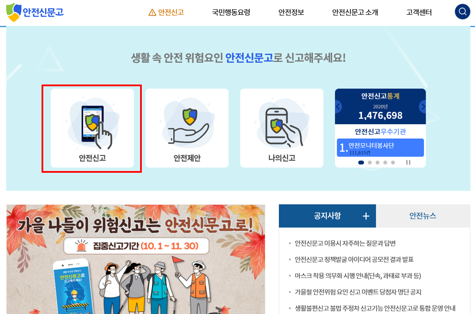 재난 또는 그 밖의 사고·위험으로부터 국민의 안전을 확보하기 위하여 안전위험 상황을 행정기관 등에 신고하는 행위입니다.