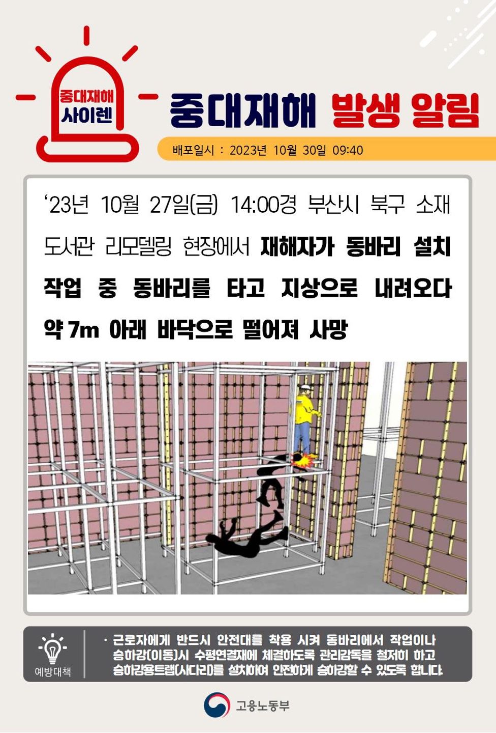 동바리 설치 작업 중 동바리를 타고 내려오다 떨어짐(7m)