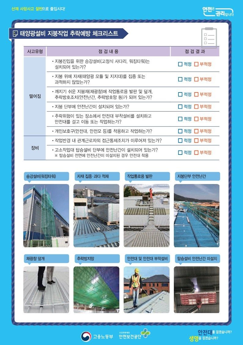 - 고소작업대 등으로 지붕아래에서 작업이 가능한지 확인하고 작업통로용 발판 및 채광창 안전덮개 설치 등 안전조치 후 작업을 실시