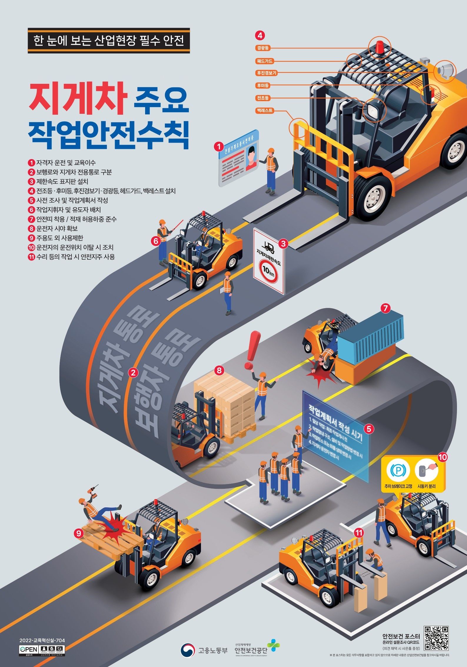 - 지게차 운행 출입구 및 이동 경로 상에는 보행자용 출입구와 보행 통로를 반드시 설치하고, 운전자의 시야를 가리는 대형 적재물 운반 시에는 후진 운행 하여 사고를 예방