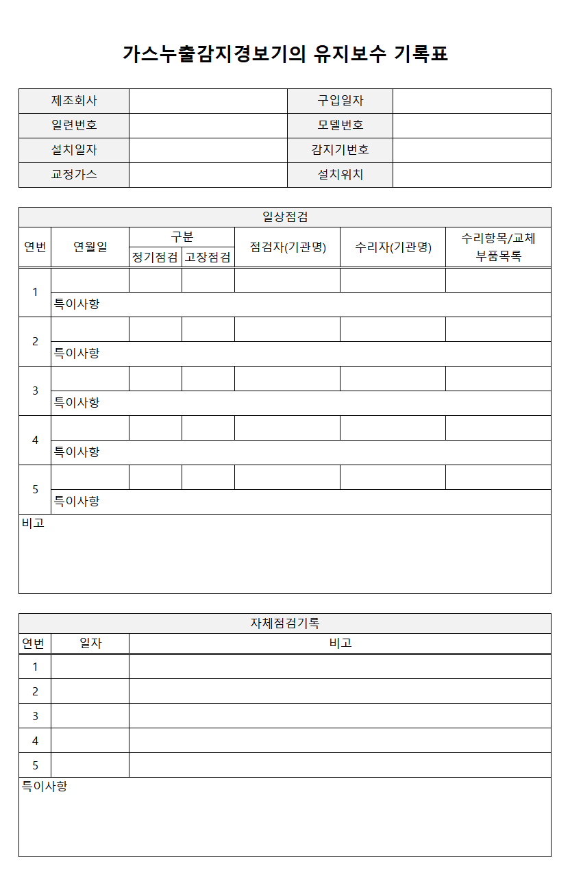 제조사의 사용설명서와 규격 요건에 부합하게 가스누출감지경보기 등 의 유지보수 기록표를 참조하여 정기적인 유지보수 계획을 수립하여야 한다.