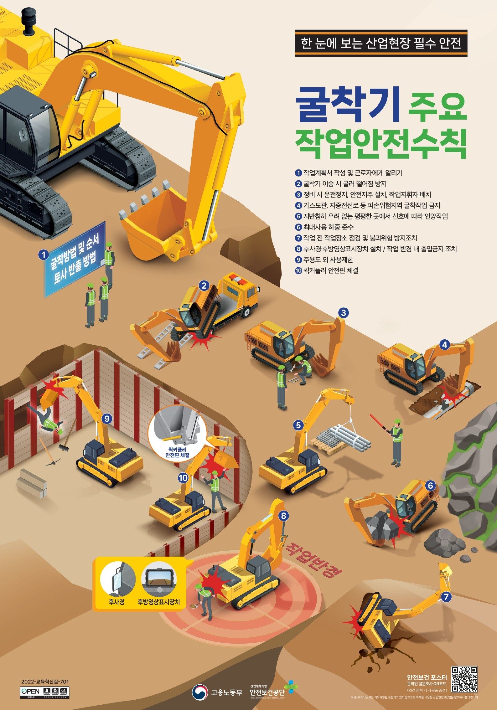 - 굴착기 작업반경 내에는 근로자의 출입을 통제하고 정해진 운행경로 및 작업장소에서 이동 또는 작업