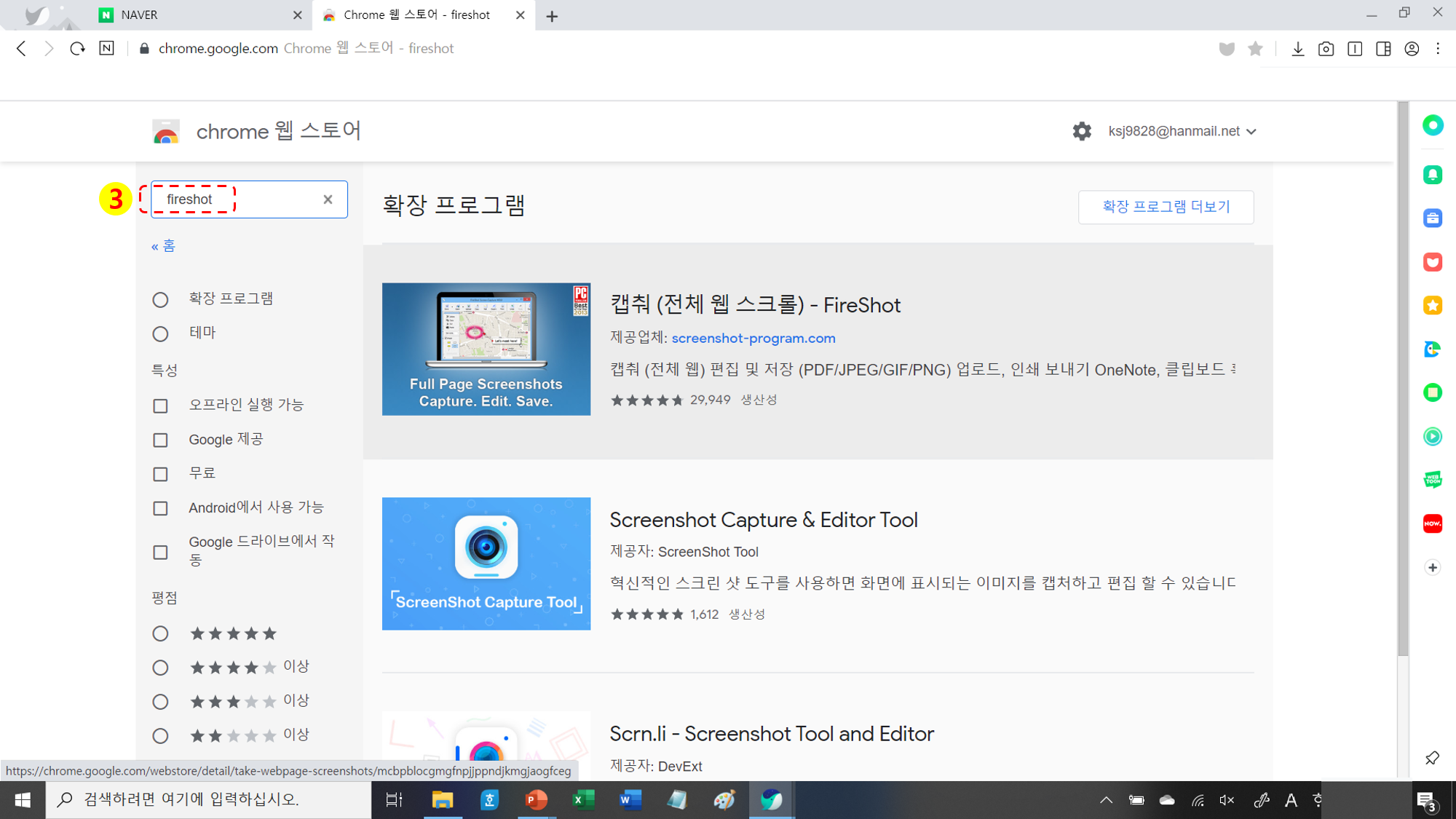 2. 스크롤 캡쳐 방법 (네이버 접속 → 확장 앱 → 호환 스토어 → 스토어 검색창에 fireshot 검색 → 설치