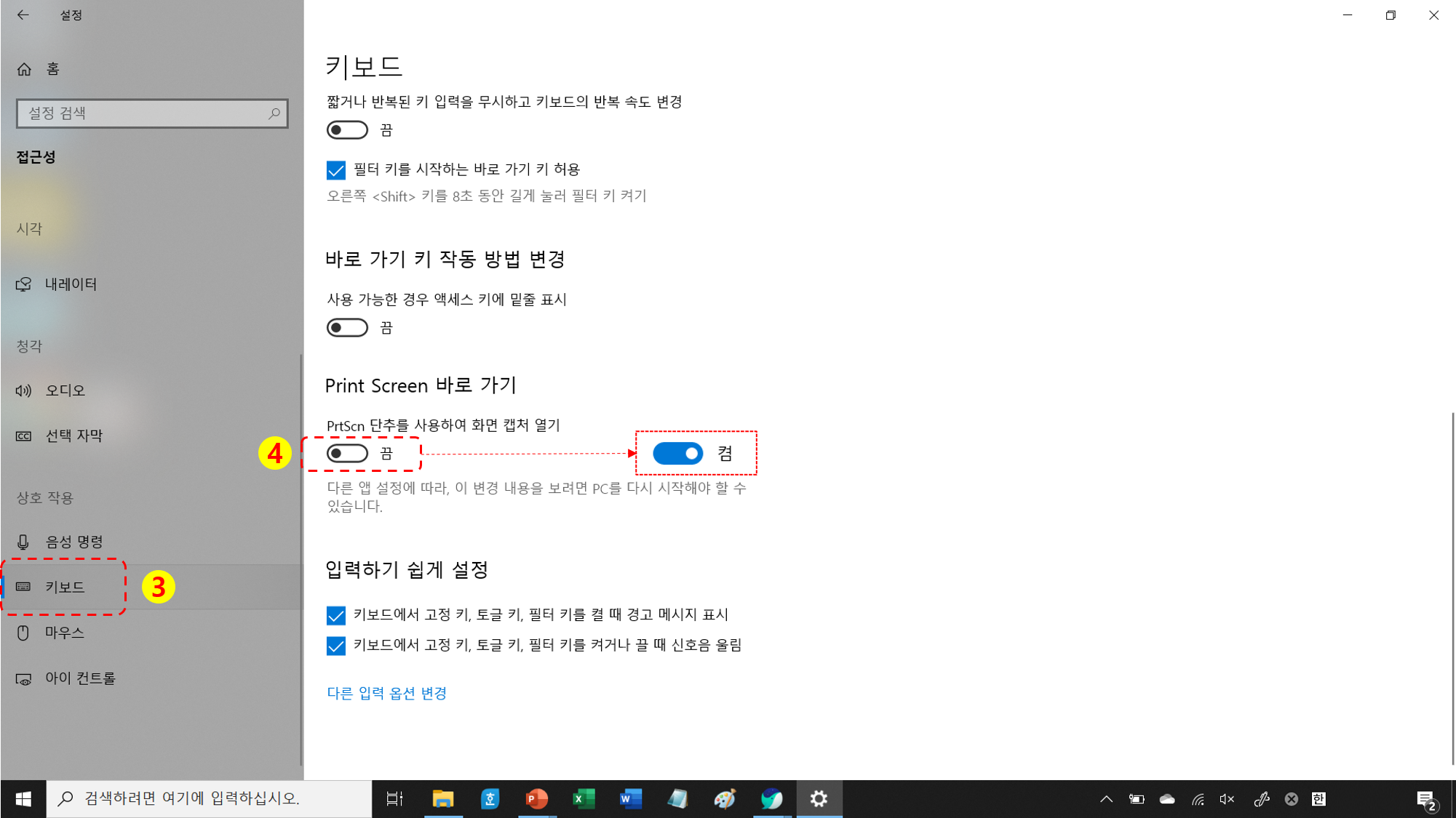 1. Prt Sc 활성화 방법 (윈도우키 → 설정 → 접근성 → 키보드 → Prt Sc활성화)
