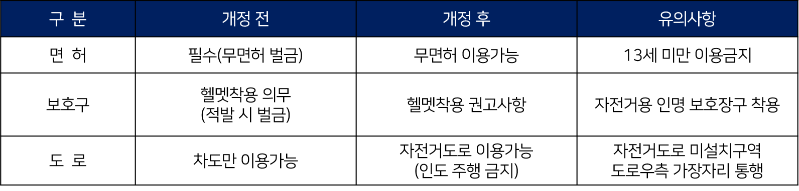 | 이용자 연령이 13세로 변경되므로 이용자가 급격하게 늘어날 것으로 예상됩니다. 이에 따른 사고도 증가할 것으로 보이기 때문에 자녀분들에게는 특별히 교육이 필요해 보입니다. [주의사항] 1) 가능하면 자전거도로로 통행 2) 자전거도로가 설치되지 않은 곳에서는 도로 우측 가장자리 통행 3) 자전거용 보호장구 착용 4) 음주운전 시 범칙금 3만 원 5) 야간 통행 시 등화장치 켜거나 발광장치 착용 |