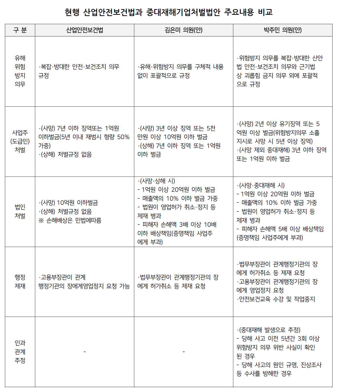 산업안전 의무를 소홀히 해 노동자를 사망에 이르게 한 사업주 및 경영책임자를 형사 처벌하고, 징벌적 손해배상을 도입하는 것을 주요 내용으로 하는 법안을 지난 6월 11일, 11월 12일 정의당 강은미 의원과 박주민 의원이 각각 대표발의하였습니다.