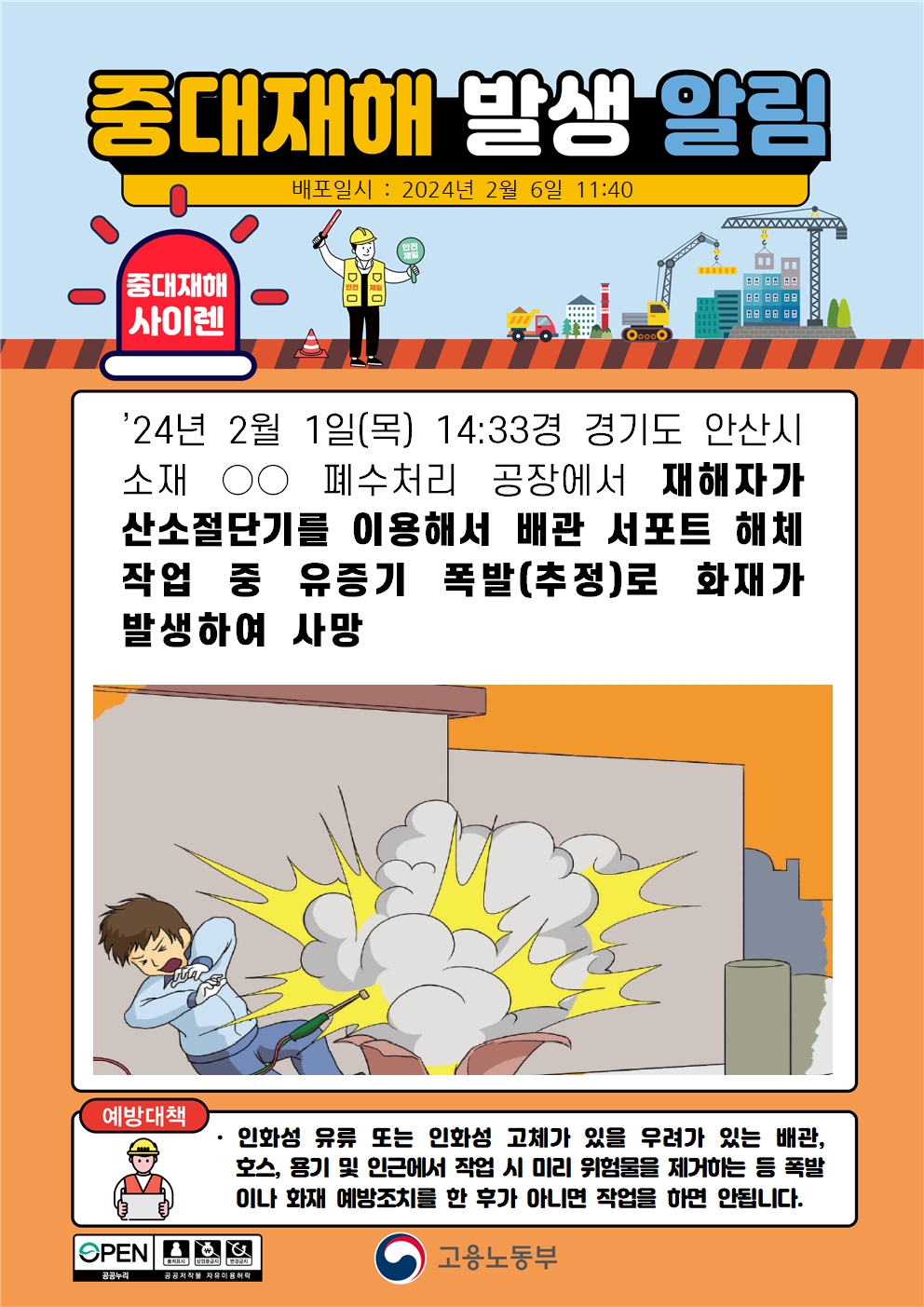산소절단기로 배관 서포트 해체 작업 중 폭발