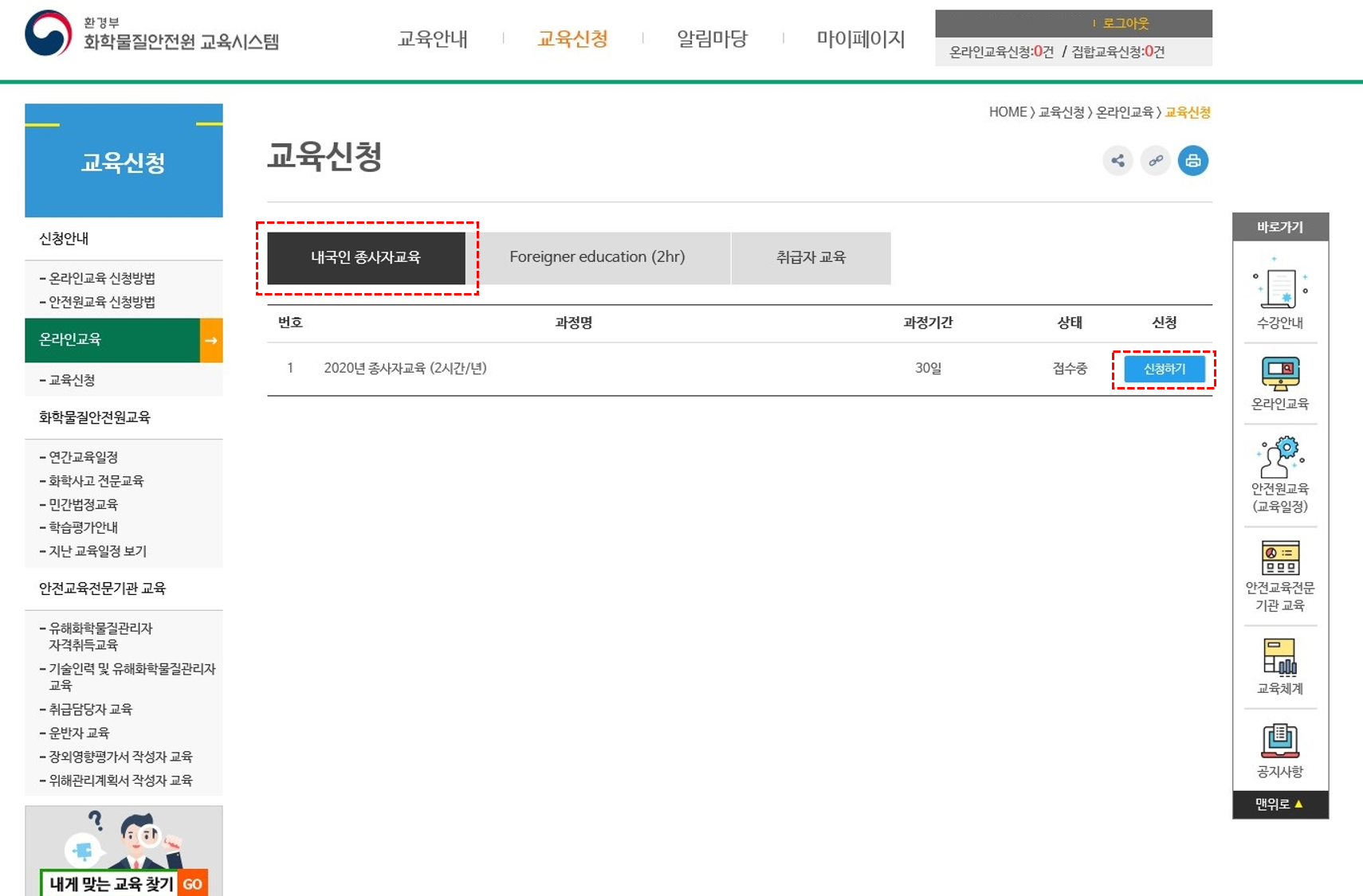 내국인 종사자 교육에서 종사자교육 신청하기 선택