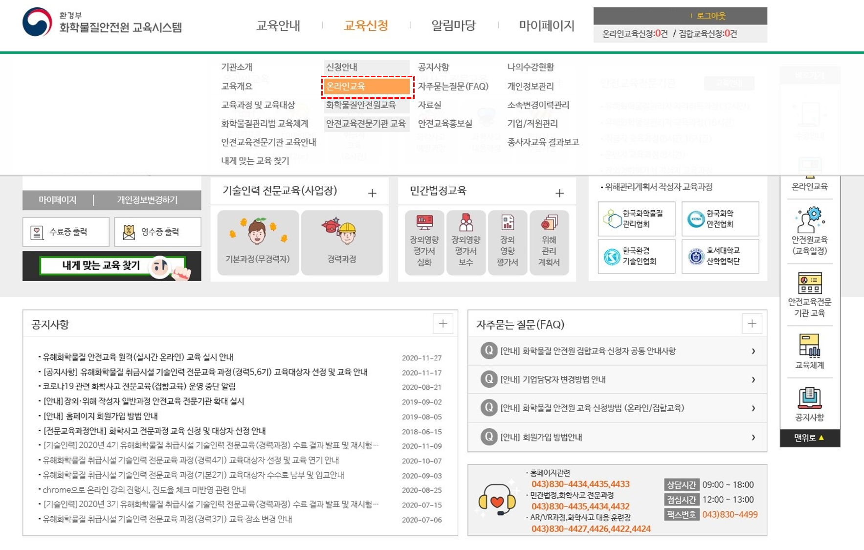 교육신청 카테고리에서 온라인 교육 선택