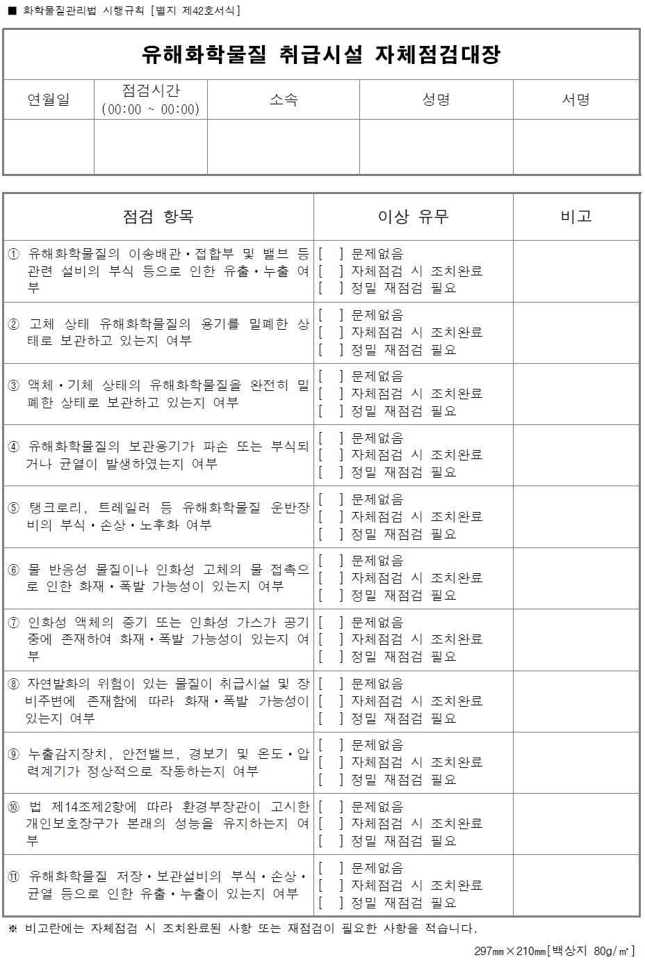 - 점검대장은 유해화학물질 취급자가 쉽게 볼 수 있거나 접근할 수 있는 곳에 비치해야 한다.