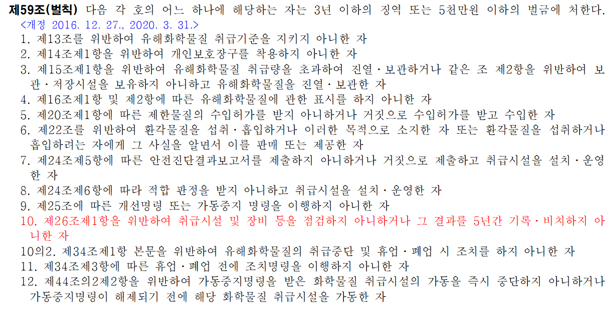 화학물질 관리법 제59조의 10호에 따라 3년 이하의 징역 또는 5천만 원 이하의 벌금