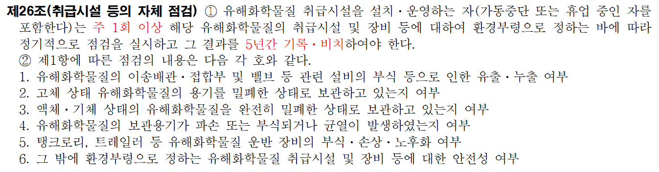 1. 법적 근거 : 화학물질 관리법 제26조(취급시설 등의 자체 점검) 및 동법 시행규칙 제24조