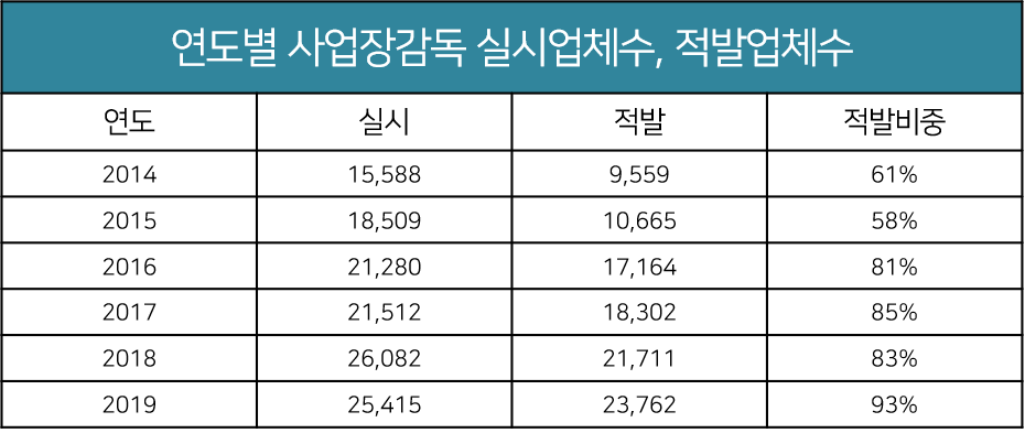 상기 표를 확인해보면 매년 감독 실시 사업장이 늘어나고 있으며, 적발업체도 증가하고 있는 것이 보일 것이다. 2019년에는 적발 비중이 93%이다. 그냥 노동부 감독을 받으면 적발돼서 과태료 등 행정처벌을 받을 수 있다는 것이다.